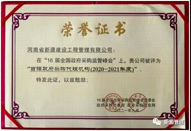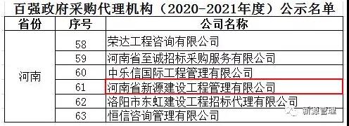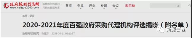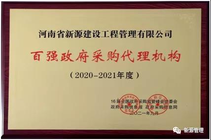 喜報|河南新源公司榮獲國家級榮譽“百強政府采購代理機構(2020-2021年度)”