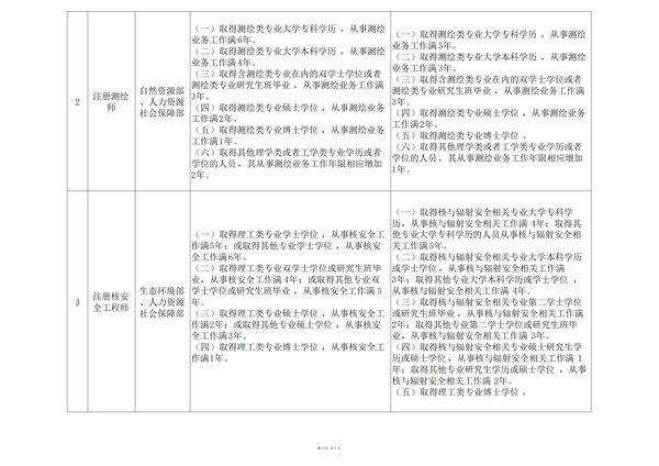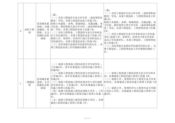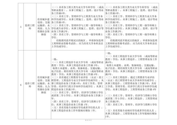 (一)具有各工程大類**大學(xué)??茖W(xué)歷(或高等職業(yè)教育),從事工程施工、監(jiān)理、設(shè)計(jì)等業(yè)務(wù)工作滿6年。(二)具有工學(xué)、管理科學(xué)與工程類**大學(xué)本科學(xué)歷或?qū)W位,從事工程施工、監(jiān)理、設(shè)計(jì)等業(yè)務(wù)工作滿4年。(三)具有工學(xué)、管理科學(xué)與工程一級(jí)學(xué)科碩士學(xué)位或**學(xué)位,從事工程施工、監(jiān)理、設(shè)計(jì)等業(yè)務(wù)工作滿2年。(四)具有工學(xué)、管理科學(xué)與工程一級(jí)學(xué)科博士學(xué)位。經(jīng)批準(zhǔn)同意開展試點(diǎn)的地區(qū),申請(qǐng)參加監(jiān)理工程師職業(yè)資格考試的,應(yīng)當(dāng)具有大學(xué)本科及以上學(xué)歷或?qū)W位。(一)具有各工程大類**大學(xué)??茖W(xué)歷(或高等職業(yè)教育),從事工程施工、監(jiān)理、設(shè)計(jì)等業(yè)務(wù)工作滿4年。(二)具有工學(xué)、管理科學(xué)與工程類**大學(xué)本科學(xué)歷或?qū)W位,從事工程施工、監(jiān)理、設(shè)計(jì)等業(yè)務(wù)工作滿3年。(三)具有工學(xué)、管理科學(xué)與工程一級(jí)學(xué)科碩士學(xué)位或**學(xué)位,從事工程施工、監(jiān)理、設(shè)計(jì)等業(yè)務(wù)工作滿2年。(四)具有工學(xué)、管理科學(xué)與工程一級(jí)學(xué)科博士學(xué)位。經(jīng)批準(zhǔn)同意開展試點(diǎn)的地區(qū),申請(qǐng)參加監(jiān)理工程師職業(yè)資格考試的,應(yīng)當(dāng)具有大學(xué)本科及以上學(xué)歷或?qū)W位。(一)具有工程造價(jià)**大學(xué)???/span>(或高等職業(yè)教育)學(xué)歷,從事工程造價(jià)業(yè)務(wù)工作滿5年; 取得土木建筑、水利、裝備制造、交通運(yùn)輸、電子信息、財(cái)經(jīng)商貿(mào)大類大學(xué)??疲ɑ蚋叩嚷殬I(yè)教育)學(xué)歷,從事工程造價(jià)業(yè)務(wù)工作滿6年。 (二)具有通過(guò)工程教育**評(píng)估(認(rèn)證)的工程管理、工程造價(jià)**大學(xué)本科學(xué)歷或?qū)W位,從事工程造價(jià)業(yè)務(wù)工作滿4年;具有工學(xué)類、管理學(xué)類、經(jīng)濟(jì)學(xué)門類大學(xué)本科學(xué)歷或?qū)W位,從事工程造價(jià)業(yè)務(wù)工作滿5年。(三)具有工學(xué)、管理學(xué)、經(jīng)濟(jì)學(xué)門類碩士學(xué)位或者第二學(xué)士學(xué)位,從事工程造價(jià)業(yè)務(wù)工作滿3年。 (四)具有工學(xué)、管理學(xué)、經(jīng)濟(jì)學(xué)門類博士學(xué)位,從事工程造價(jià)業(yè)務(wù)工作滿1年。 (五)具有其他**相應(yīng)學(xué)歷或者學(xué)位的人員,從事工程造價(jià)業(yè)務(wù)工作年限相應(yīng)增加1年。 (一)具有工程造價(jià)**大學(xué)專科(或高等職業(yè)教育)學(xué)歷,從事工程造價(jià)、工程管理業(yè)務(wù)工作滿4年; 取得土木建筑、水利、裝備制造、交通運(yùn)輸、電子信息、財(cái)經(jīng)商貿(mào)大類大學(xué)專科(或高等職業(yè)教育)學(xué)歷,從事工程造價(jià)、工程管理業(yè)務(wù)工作滿5年。 (二)具有工程造價(jià)、通過(guò)工程教育**評(píng)估(認(rèn)證)的工程管理**大學(xué)本科學(xué)歷或?qū)W位,從事工程造價(jià)、工程管理業(yè)務(wù)工作滿3年;具有工學(xué)類、管理學(xué)類、經(jīng)濟(jì)學(xué)門類大學(xué)本科學(xué)歷或?qū)W位,從事工程造價(jià)、工程管理業(yè)務(wù)工作滿4年。 (三)具有工學(xué)、管理學(xué)、經(jīng)濟(jì)學(xué)門類碩士學(xué)位或者第二學(xué)士學(xué)位,從事工程造價(jià)、工程管理業(yè)務(wù)工作滿2年。 (四)具有工學(xué)、管理學(xué)、經(jīng)濟(jì)學(xué)門類博士學(xué)位。 (五)具有其他**相應(yīng)學(xué)歷或者學(xué)位的人員,從事工程造價(jià)、工程管理業(yè)務(wù)工作年限相應(yīng)增加1年。 (一)取得工程類或工程經(jīng)濟(jì)類大學(xué)??茖W(xué)歷,工作滿6年,其中從事建設(shè)工程項(xiàng)目施工管理工作滿4年。(二)取得工程類或工程經(jīng)濟(jì)類大學(xué)本科學(xué)歷,工作滿4年,其中從事建設(shè)工程項(xiàng)目施工管理工作滿3年。(三)取得工程類或工程經(jīng)濟(jì)類雙學(xué)士學(xué)位或研究生班畢業(yè),工作滿3年,其中從事建設(shè)工程項(xiàng)目施工管理工作滿2年。(四)取得工程類或工程經(jīng)濟(jì)類碩士學(xué)位,工作滿2年,其中從事建設(shè)工程項(xiàng)目施工管理工作滿1年。(五)取得工程類或工程經(jīng)濟(jì)類博士學(xué)位,從事建設(shè)工程項(xiàng)目施工管理工作滿1年。(一)取得工程類或工程經(jīng)濟(jì)類**大學(xué)??茖W(xué)歷,從事建設(shè)工程項(xiàng)目施工管理工作滿4年。(二)取得工學(xué)、管理科學(xué)與工程類**大學(xué)本科學(xué)歷,從事建設(shè)工程項(xiàng)目施工管理工作滿3年。(三)取得工學(xué)、管理科學(xué)與工程類**大學(xué)碩士及以上學(xué)歷,從事建設(shè)工程項(xiàng)目施工管理工作滿2年。